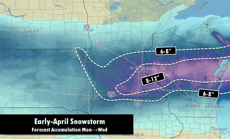 The leading edge of an early-April snowstorm is just starting to slide it's way through Minnesota. The biggest accumulations thru Wednesday are expected in a line from southeastern MN through central WI. The most snow in a three day period in April at KMSP - 13.9" in 1983.pic.twitter.com/ujk1BtgrD7