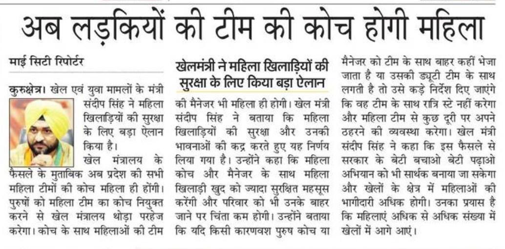हरियाणा की बेटियों के सम्मान में खेल मंत्रालय का बड़ा फैसला। अब महिला टीम के साथ नहीं होगी पुरुष कोच की नियुक्ति। टीम की कोच और मैनेजर दोनो होंगी महिलाएं।pic.twitter.com/yBVfIGY5CK