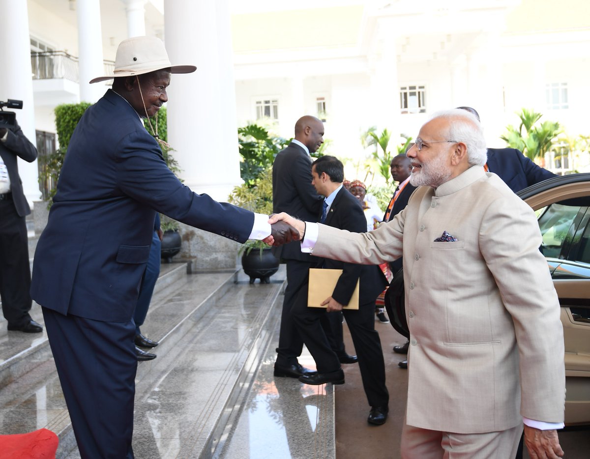 PM @narendramodi at the ceremonial reception with the President of Uganda @KagutaMuseveni at the State House, Uganda.pic.twitter.com/2aF6xUBPk9