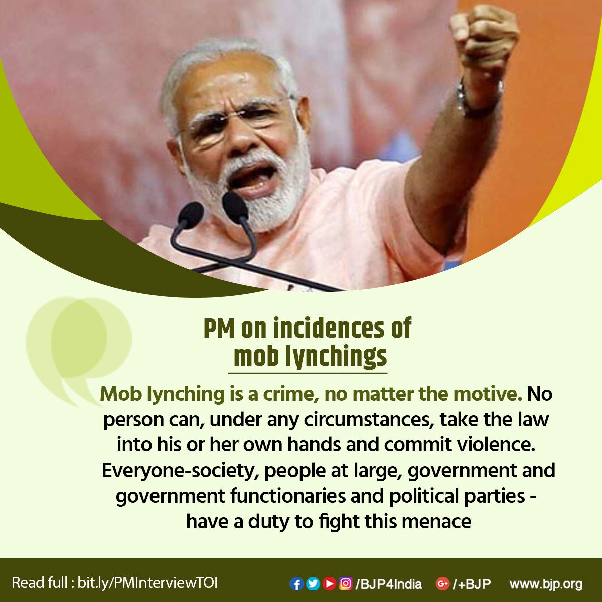 "Mob lynching is a crime, no matter the motive. No person can, under any circumstances, take the law into his or her own hands and commit violence. Everyone have a duty to fight this menace": PM @narendramodi on incidences of mob lynchings http://bit.ly/PMInterviewTOI pic.twitter.com/WIZYc4RmA4