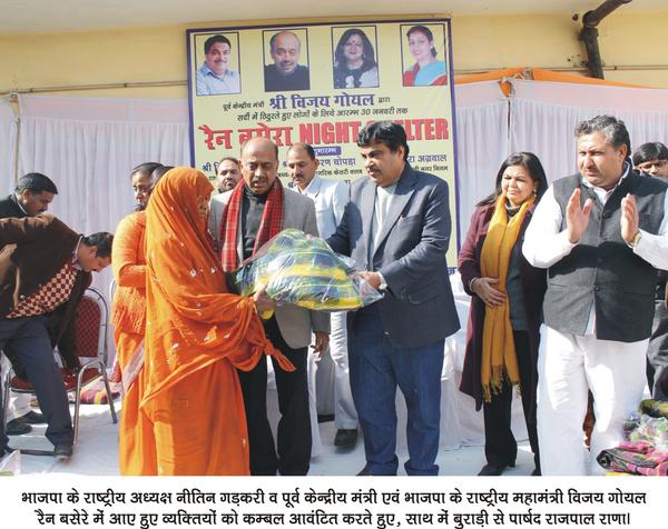 Shri Nitin Gadkari & Shri @vijaygoelbjp distributing blankets to people in Delhi. #YuvaiTV #News #Indiapic.twitter.com/8cWYmQ1a