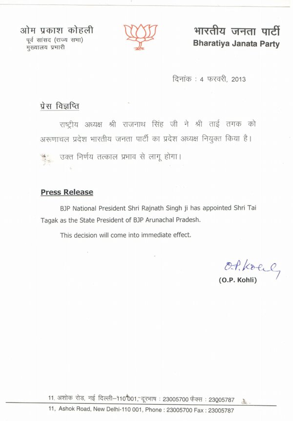 Shri Rajnath Singh has appointed Shri Tai Tagak as the State President of BJP Arunachal Predesh. #news #Indiapic.twitter.com/qn67bmtO