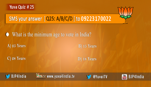 #YuvaQuiz 25: What is the minimum age to vote in India? SMS your answer [Q25: A/B/C/D] to 09223170022.pic.twitter.com/bxUGn2rzHR