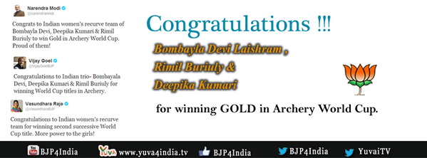 Congratulations to Bombayla Devi Laishram, Rimil Buriuly and Deepika Kumari for winning GOLD in Archery World Cup.pic.twitter.com/lkluirieOV