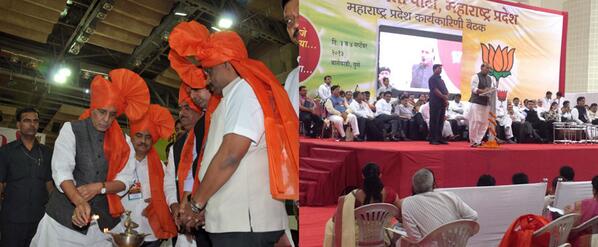 Shri @BJPRajnathSingh at BJP Maharashtra State Executive meeting, Balewadi Stadium, Pune.pic.twitter.com/Kfy5AFCIfZ