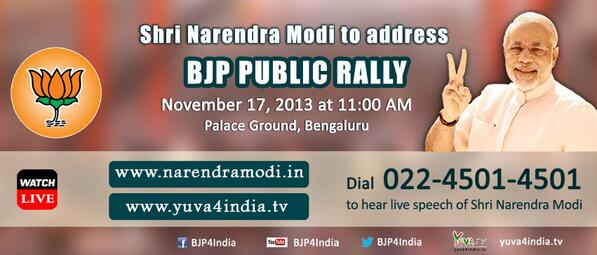 Shri @narendramodi will address #BharatJitao Rally at Bengaluru. You can watch LIVE at http://yuva4india.tv .pic.twitter.com/hLPK3rySu8
