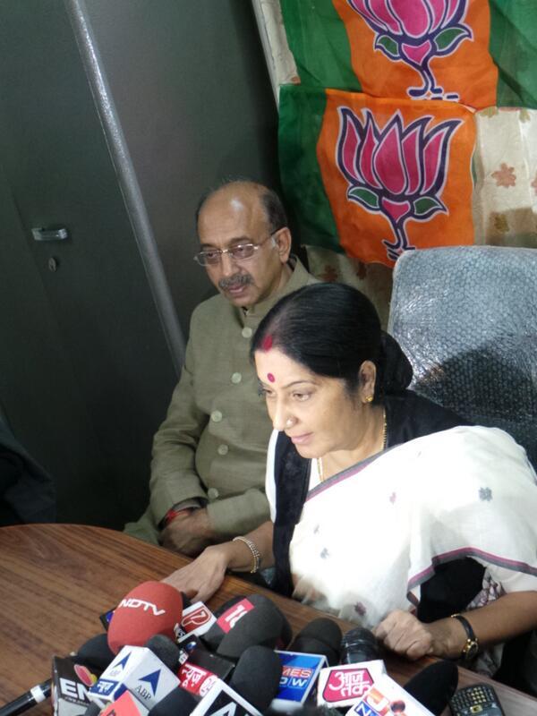 Smt. @SushmaSwarajbjp addressing press at Amar Colony, Delhi. #LetsWinDelhipic.twitter.com/qqASPAmNvP