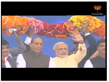Shri @narendramodi being welcomed at the stage of Maha Garjana Rally - LIVE at http://yuva4india.tv . #NaMoInMumbaipic.twitter.com/WgBCMnOCQ8