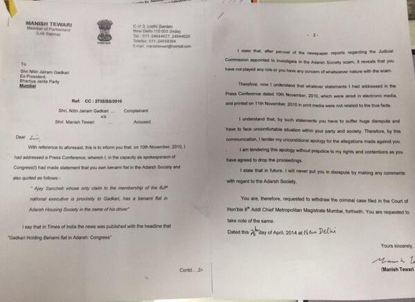 . @ManishTewari apologies for making wrong statement about Shri @nitin_gadkari after defamation suit - pic.twitter.com/3HoWtb4psa #AdarshScam