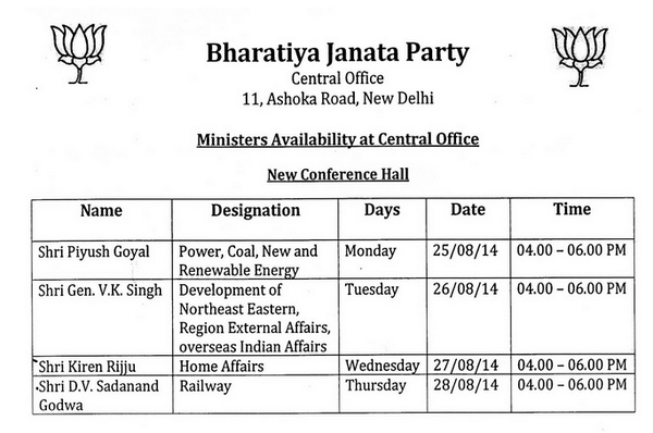 #MahraModiJitega RT @YuvaiTV Scheduled programme of Union Ministers availability at BJP Central Office.pic.twitter.com/XKHzkW8deT