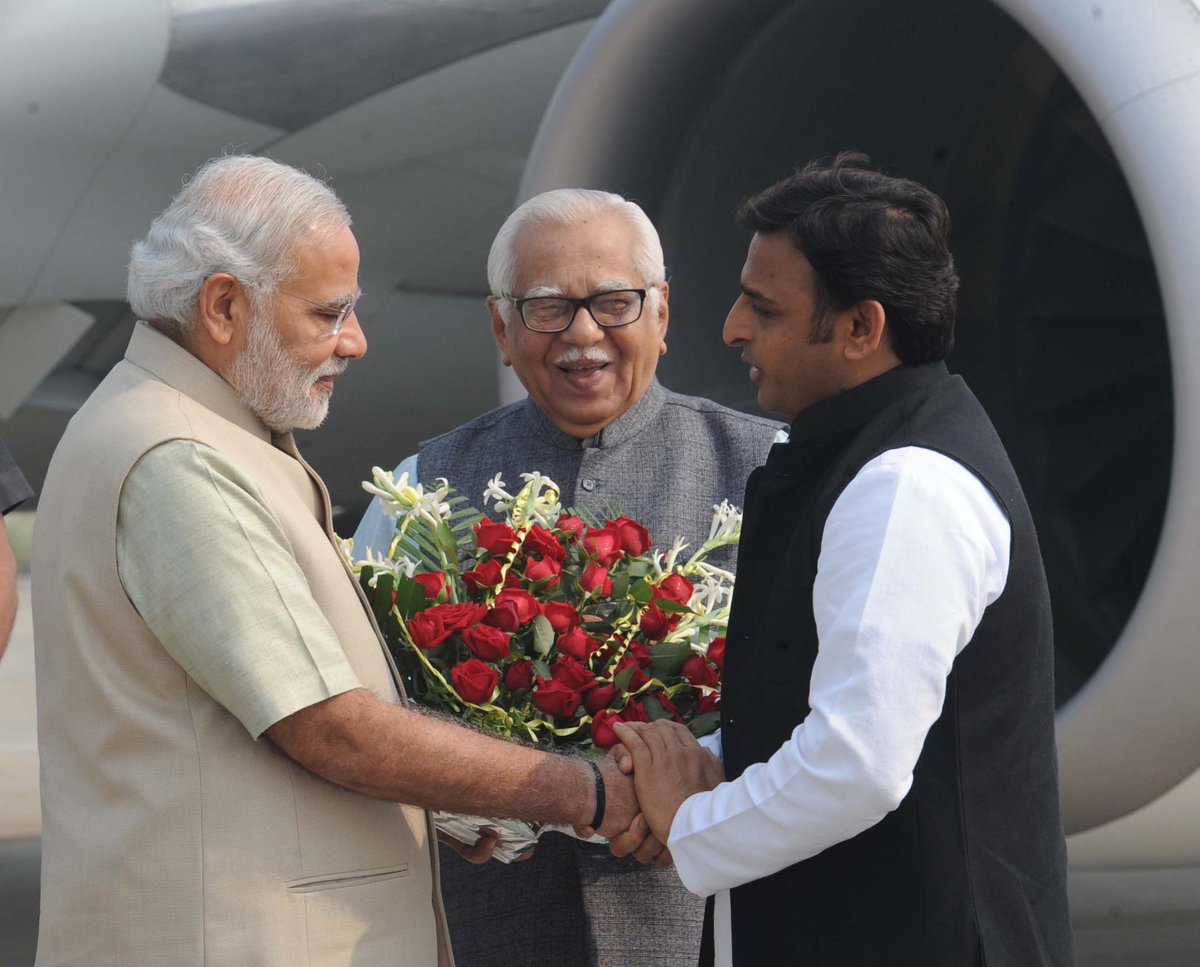 PM Shri @narendramodi being received by Governor Shri Ram Naik & CM of UP Shri @yadavakhilesh in Varanasi.pic.twitter.com/1Hha1TYuPL