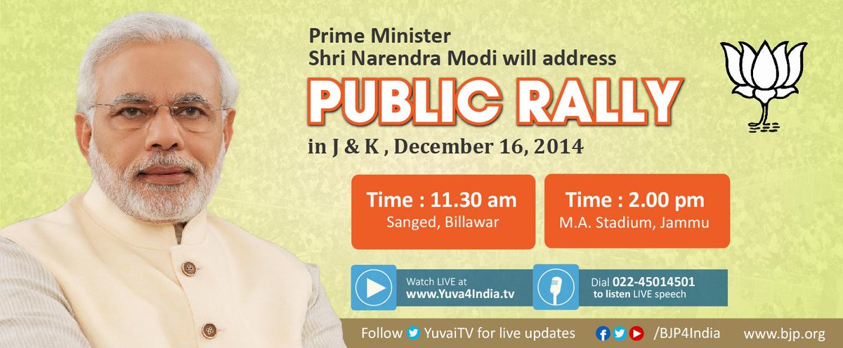 Today's schedule of PM Shri @narendramodi rallies in Jammu. You can watch LIVE webcast at http://yuva4india.tv .pic.twitter.com/SralojfEzu