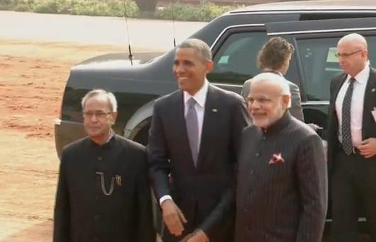 Shri @narendramodi & Shri @RashtrapatiBhvn with Shri @BarackObama at Rashtrapati Bhawan - http://yuva4india.tv pic.twitter.com/2PR3WKaKam