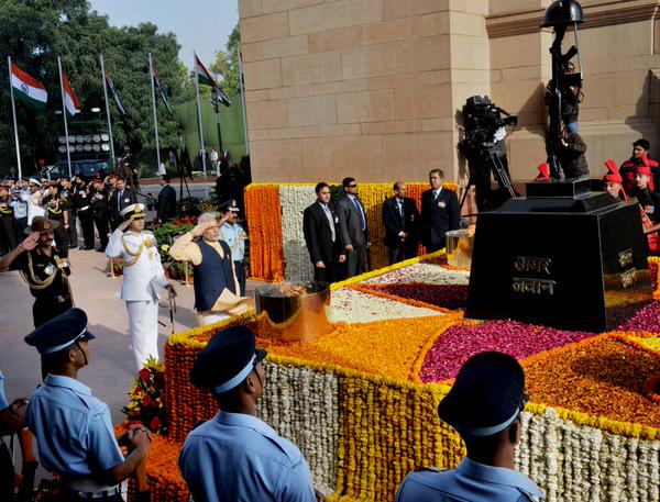 प्रधानमंत्री प्रथम विश्‍व युद्ध के शताब्‍दी समारोह के अवसर पर अमर जवान ज्‍योति पर माल्यार्पण करते हुए।pic.twitter.com/64UZbUbJ9Z