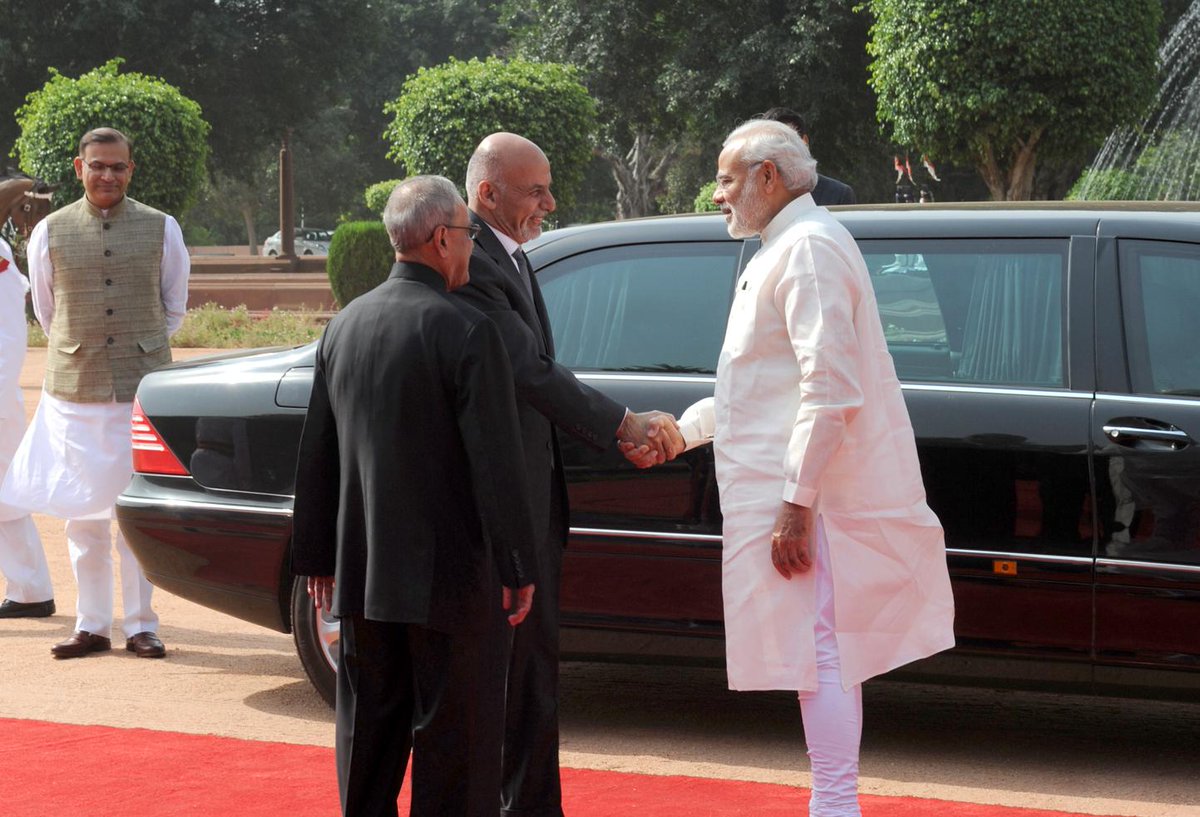 Afghanistan President Dr. @ashrafghani being welcomed by the President & the PM at Ceremonial Reception.pic.twitter.com/iT1jXc8GES