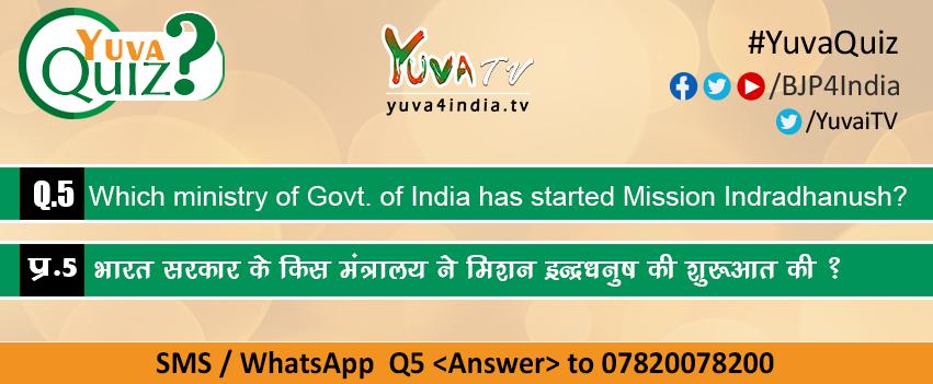 #YuvaQuiz प्र.५ - भारत सरकार के किस मंत्रालय ने मिशन इ्रन्द्रधनुष की शुरूआत की? एस.एम.एस/व्हाट्सऐप करें ।pic.twitter.com/Q3ejWtEkcC