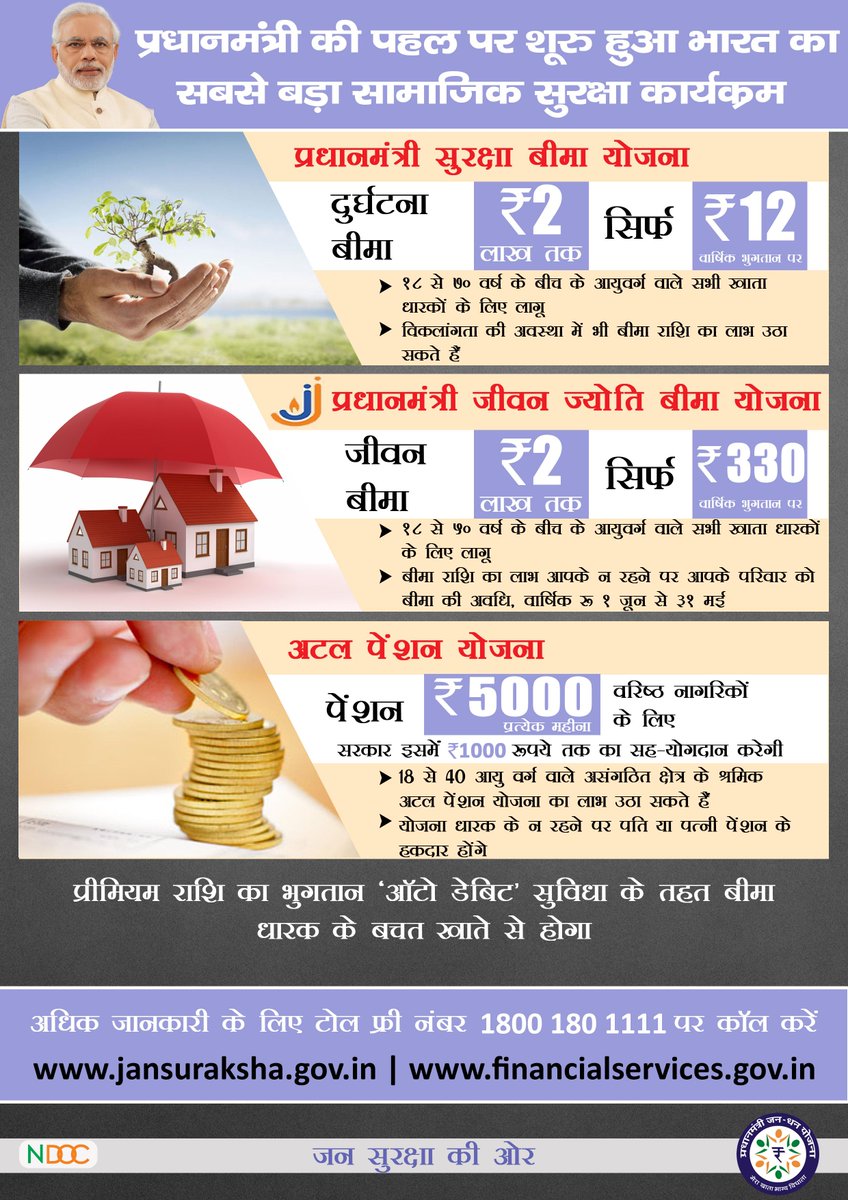 प्रधानमंत्री श्री नरेन्द्र मोदी समर्पित करेंगे जन-धन के बाद जन सुरक्षा की ३ नई योजनाएं। #AtalJanBimahttps://twitter.com/BJP4India/status/597014875466895361 …