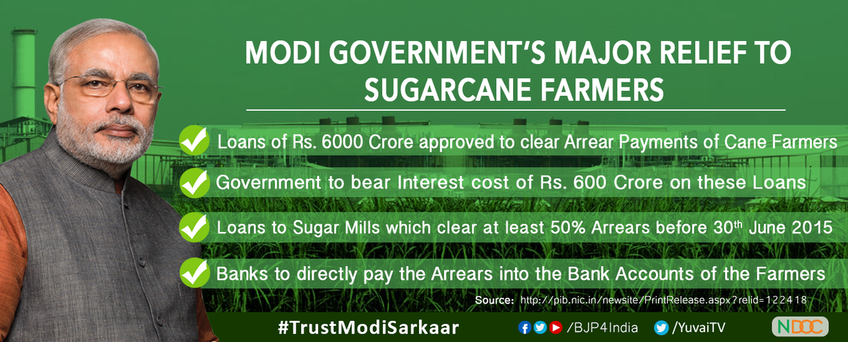 Modi Government's major relief to sugarcane farmers. #TrustModiSarkaarpic.twitter.com/fGUl5ZpjoR