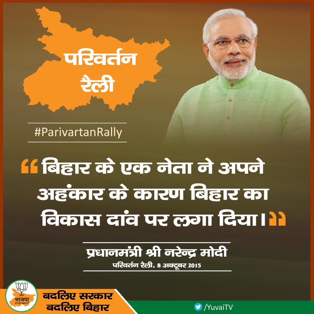 बिहार के एक नेता ने अपने अहंकार के कारण बिहार का विकास दांव पर लगा दिया। #ParivartanRallypic.twitter.com/BOQ4Qoi9Oa