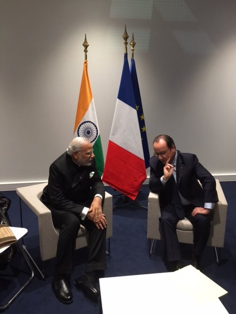 PM @narendramodi begins engagements at #COP21 by meeting President @fhollande.pic.twitter.com/q6ie9aeZir