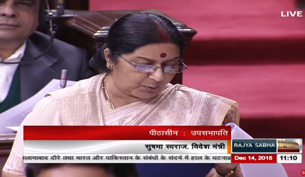 EAM, Smt. @SushmaSwaraj speaking in Rajya Sabha on her recent Pakistan visit.pic.twitter.com/r1mF1pLtuW