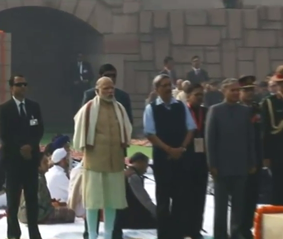 PM @narendramodi with the Chiefs of the Tri-Services & the RM @manoharparrikar at Rajghat. #MahatmaGandhipic.twitter.com/cZnnEA88pG