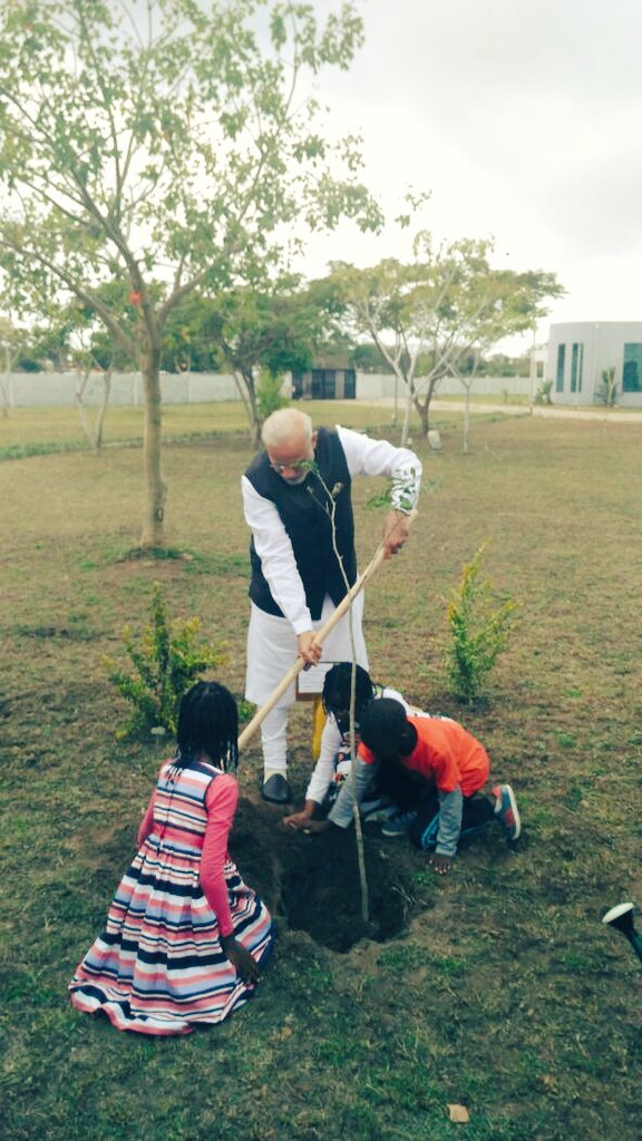 PM @narendramodi plants a sapling of African mahogany at CITD. #ModiInAfricapic.twitter.com/33BYuS77rf