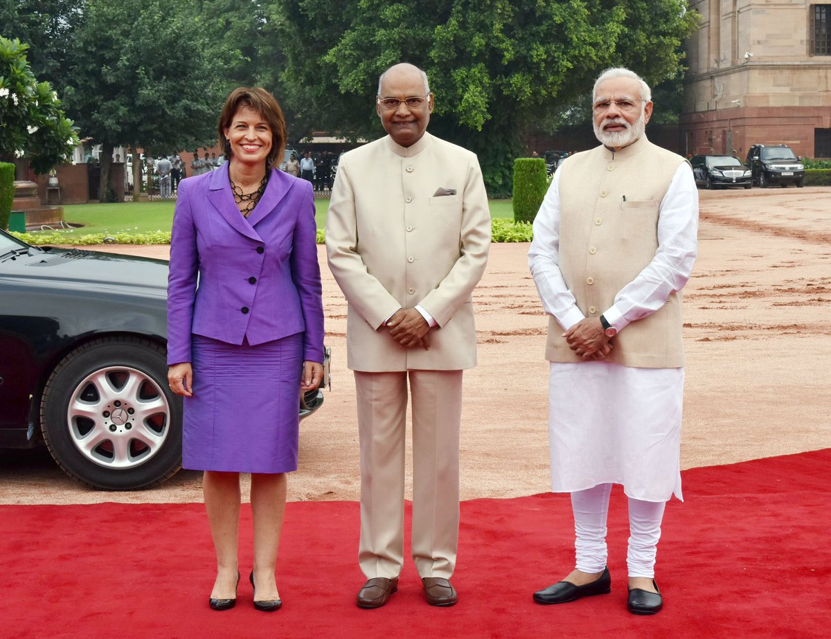 The President and PM @narendramodi with Ms. Doris Leuthard, President of Switzerland on her ceremonial reception at @rashtrapatibhvnpic.twitter.com/lGGDw7Eh5Y