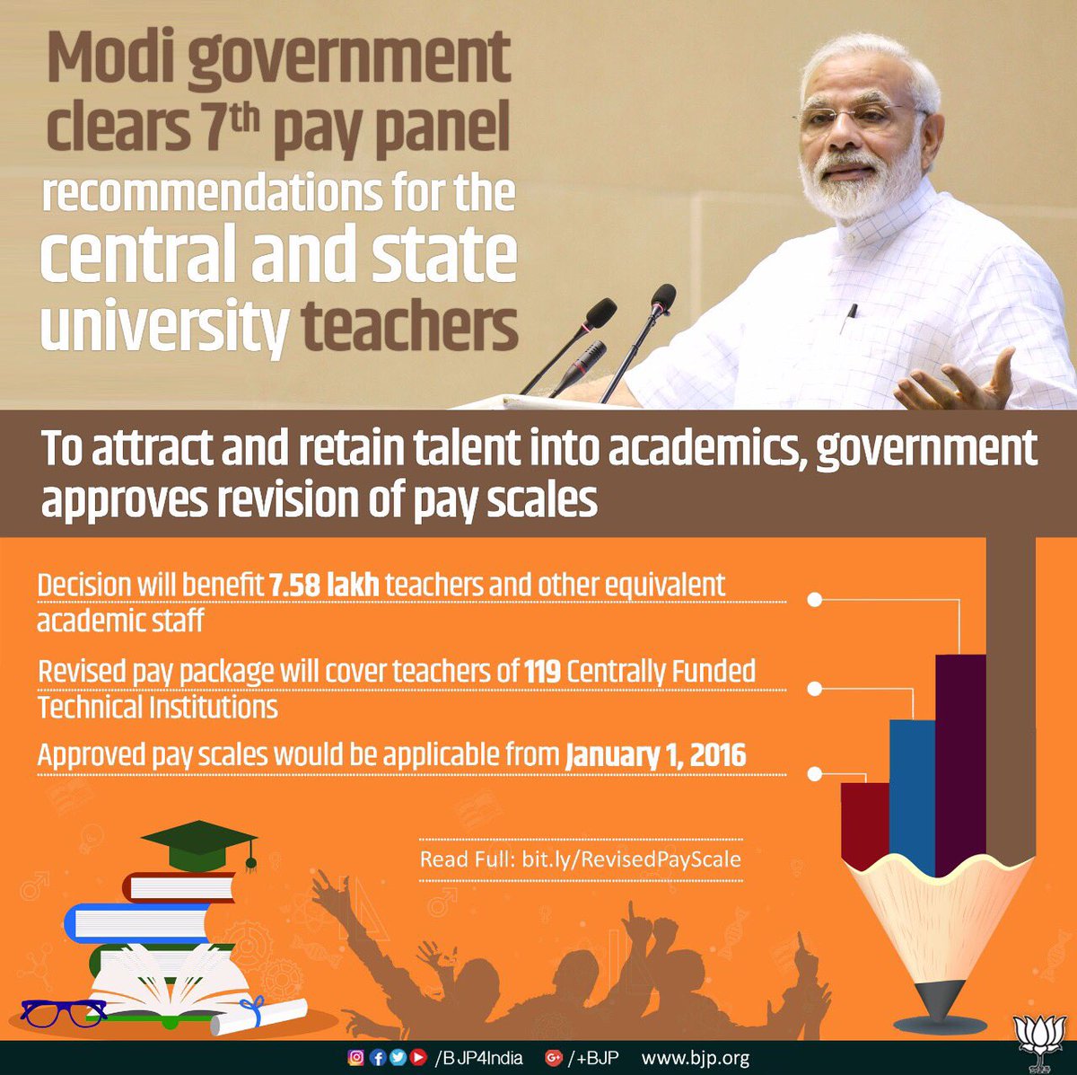 Modi Govt clears 7th pay recommendations for central and state university benefitting 7.58 lakh teachers & other equivalent academic staff.pic.twitter.com/pLPGVOMt7e