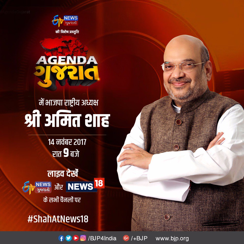 भाजपा राष्ट्रीय अध्यक्ष श्री @AmitShah आज रात 9 बजे 'एजेंडा गुजरात' कार्यक्रम में हिस्सा लेंगे। लाइव देखें @EtvGujaratiNews एवं @News18India पर। #ShahAtNews18 #AgendaGujaratpic.twitter.com/pwZ6YJ3dvp