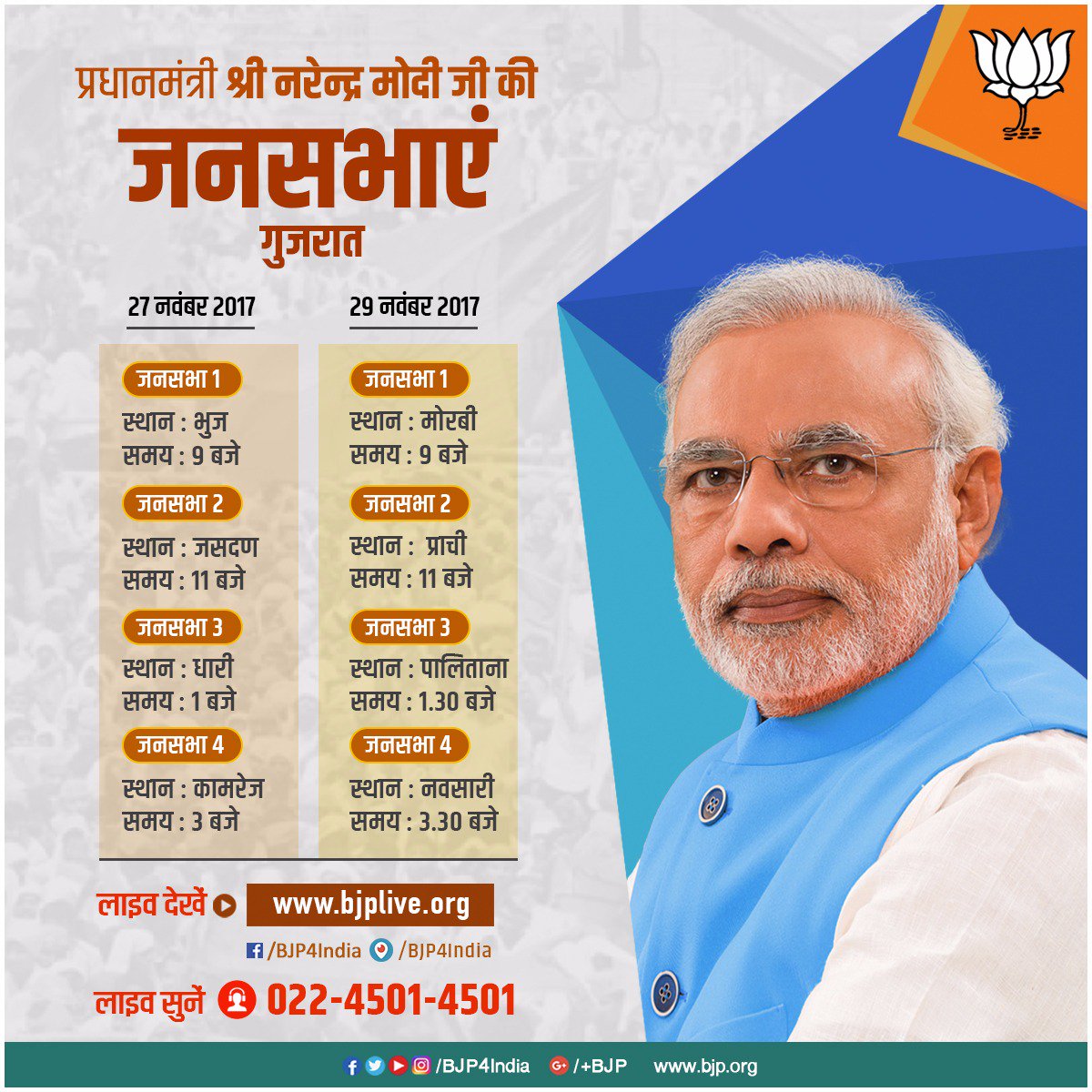 पीएम श्री नरेन्द्र मोदी 27 नवम्बर और 29 नवम्बर को गुजरात में चुनावी जनसभाओं को संबोधित करेंगे। लाइव देखें http://facebook.com/BJP4India  और http://bjplive.org  पर। लाइव सुननें के लिए 02245014501 डायल करें। #BJP4Gujaratpic.twitter.com/l5Eesw4ptN