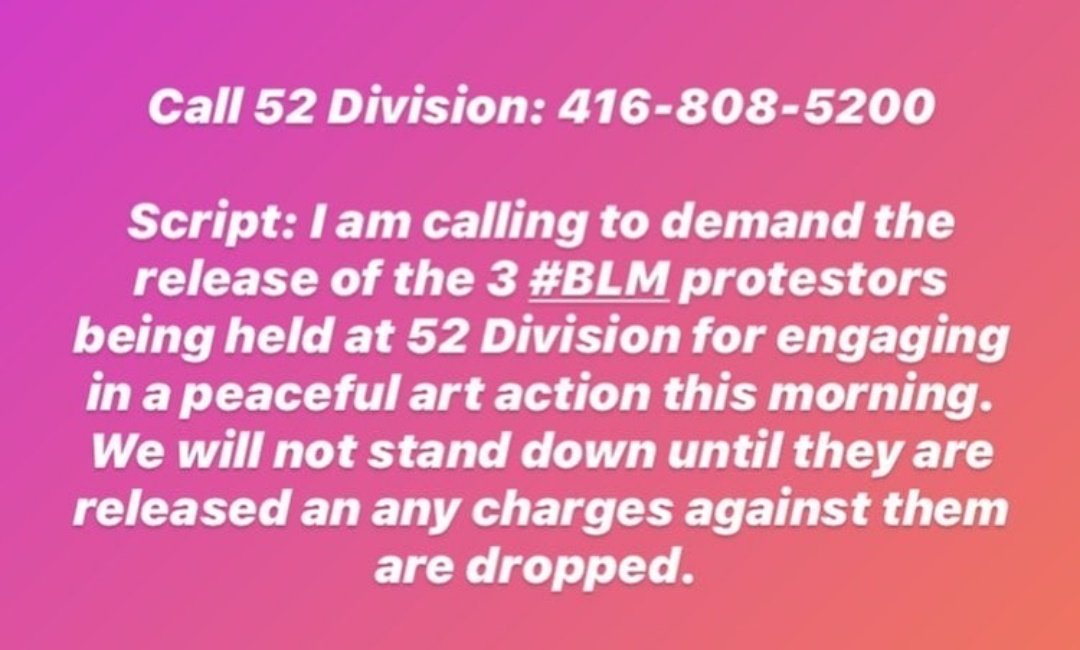 Urgent call to action: 3 @BLM_TO activists were arrested for engaging in a peaceful art action this morning. Please call 416-808-5200 (52 Division) to demand their release. Script below. Thank you! @ETFOeducators @ETFOPeelpic.twitter.com/950Mt2Y4qs