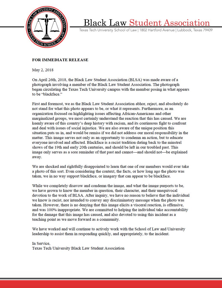Please see our attached official statement regarding the recent blackface incident. Thank you for your support as we work through the situation and move forward.pic.twitter.com/CVKx5DjhGj