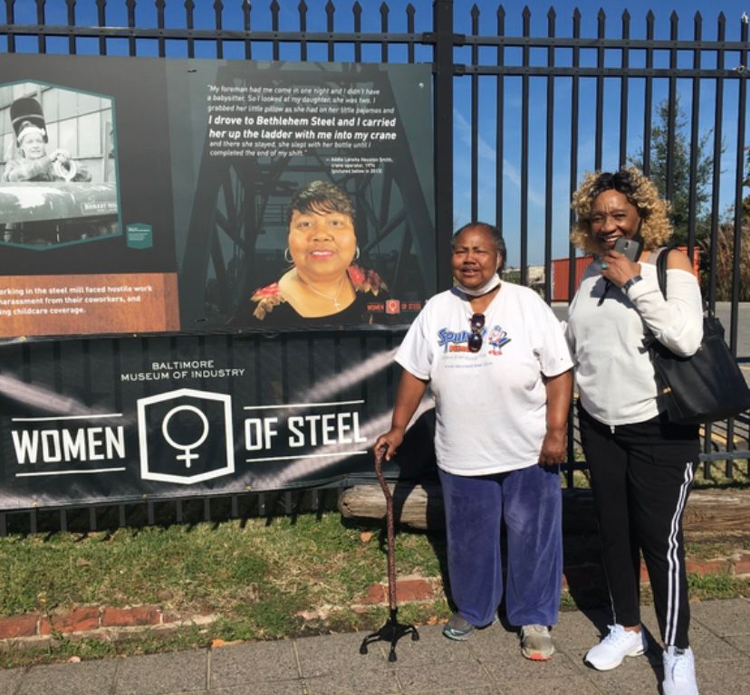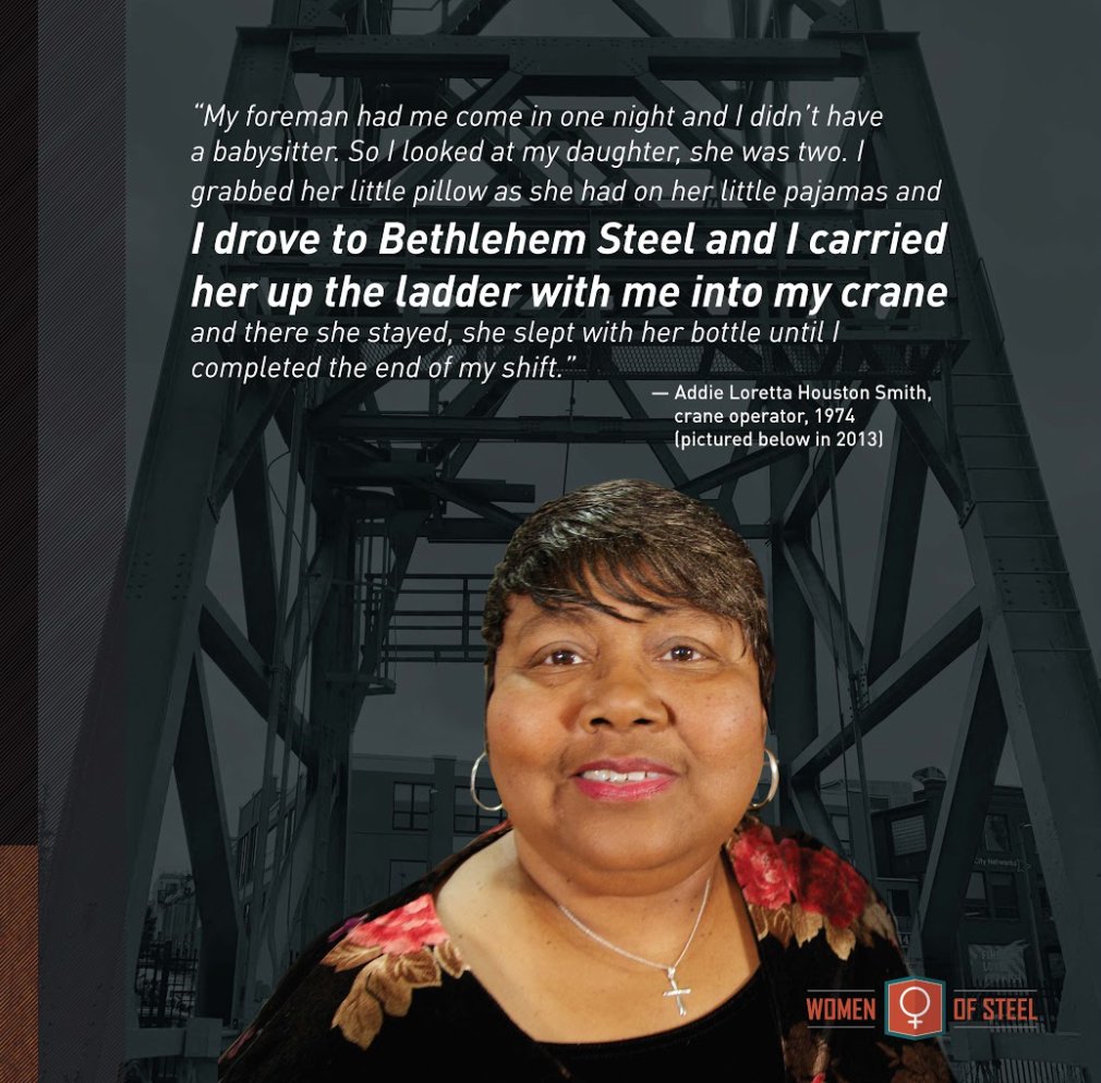Addie Smith (on left) is one of the women featured in the BMI's newest exhibit, Women of Steel. Previously a crane operator for Bethlehem Steel, her story encapsulates the resiliency of working women and mothers in a male dominated industry.