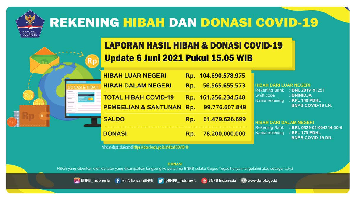Update Laporan Penggunaan Dana Hibah Penanganan COVID-19 tanggal 6 Juni 2021 pukul 15.05 WIB.