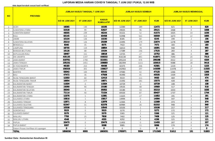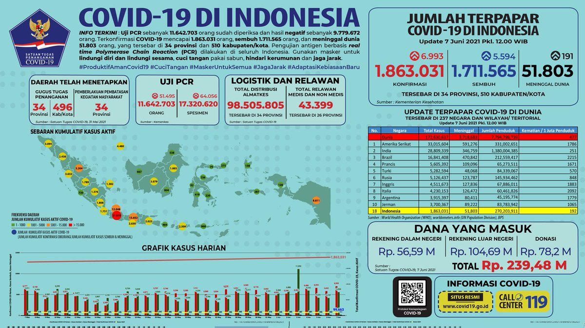 Update Infografis percepatan penanganan COVID-19 di Indonesia per tanggal 7 Juni 2021 Pukul 12.00 WIB.