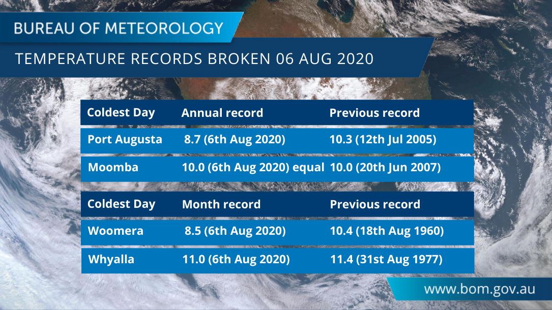 Two annual records and 8 August records for lowest daily Maximum temperature were broken yesterday including at Woomera, Hawker, Whyalla, Yongala, Port Augusta, Moomba, Tarcoola and Minnipa. More records possible today. Check latest observations at http://ow.ly/q4tb50AT6UN pic.twitter.com/PiFNgPnzny