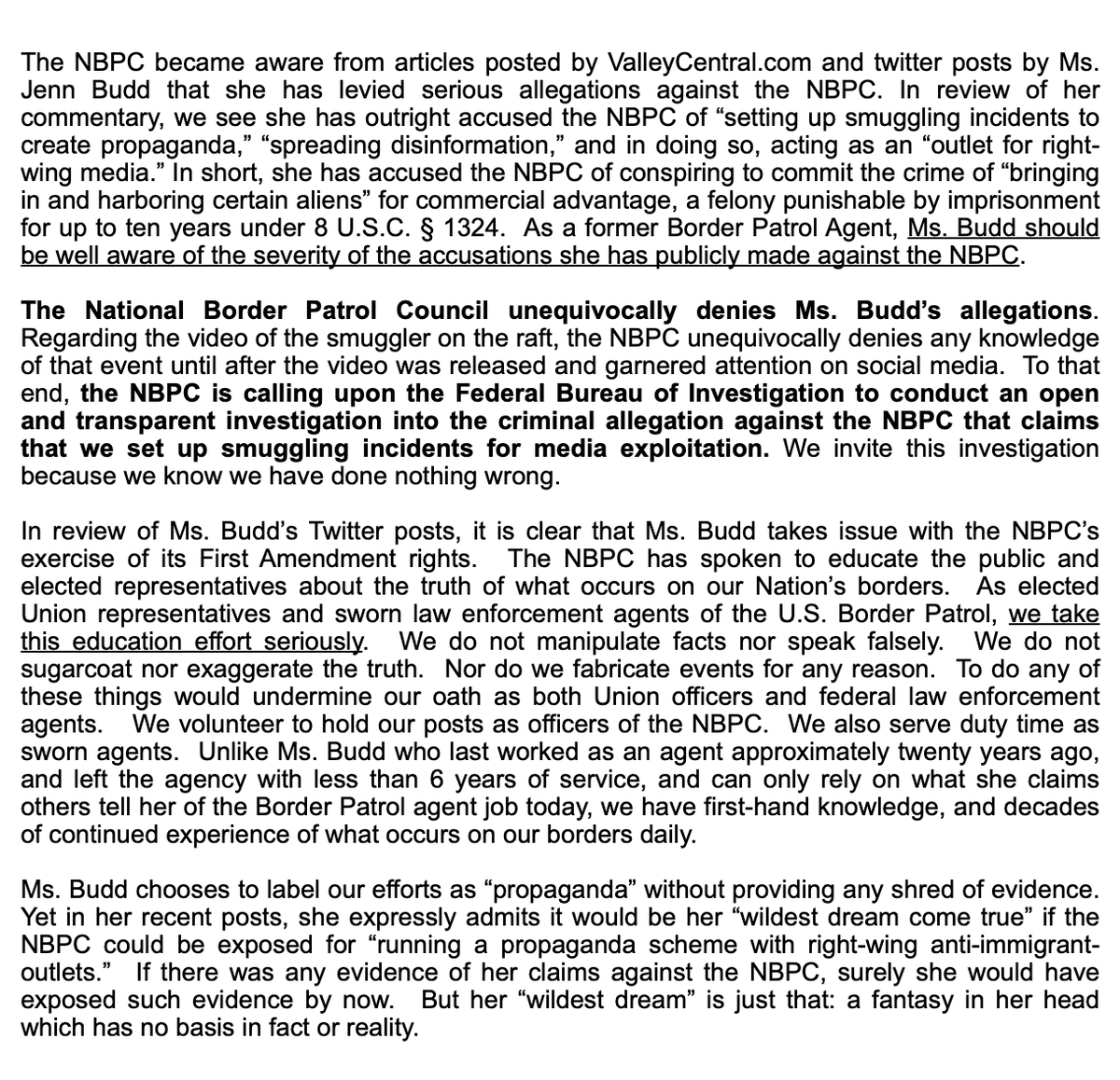The National Border Patrol Council issues the following statement in response to the criminal allegations made against it by Jenn Budd regarding a video posted depicting a smuggling event.