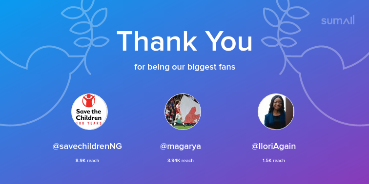 Our biggest fans this week: savechildrenNG, magarya, IloriAgain. Thank you! via https://sumall.com/thankyou?utm_source=twitter&utm_medium=publishing&utm_campaign=thank_you_tweet&utm_content=text_and_media&utm_term=eeac370bcae51a490a9efdd1 …pic.twitter.com/YL6vl4Boez