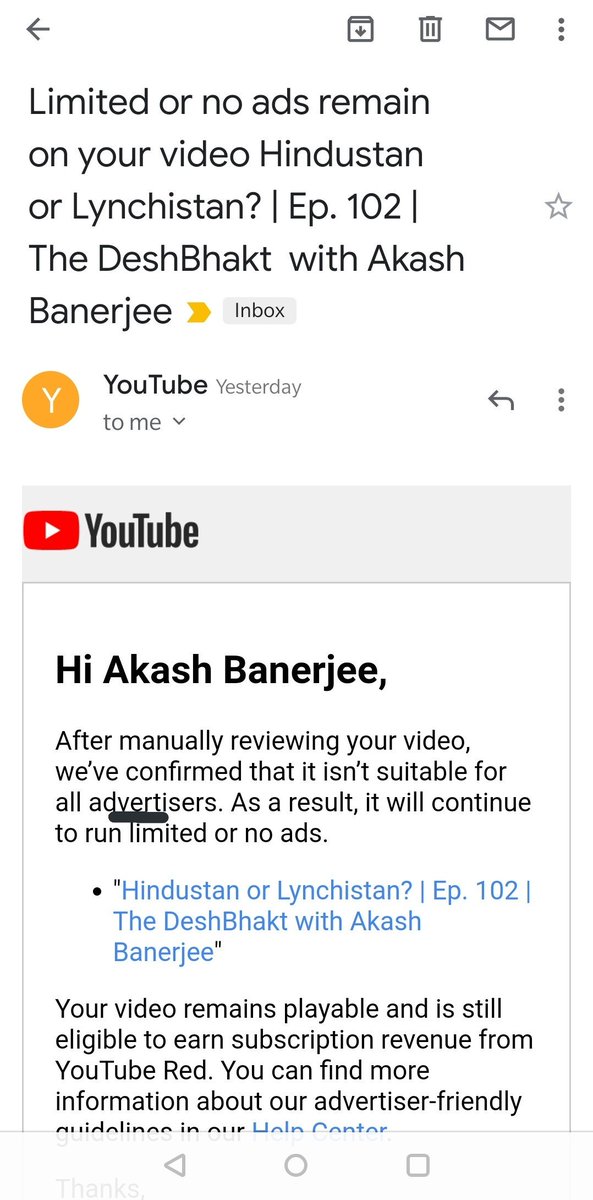 Morning shout-out to @TeamYouTube for demonitizing YET another video after manual review - despite 2lakh+ views & 1.6million watch minutes 😇🤔 Big thanks to http://factchecker.in  for collecting the inconvenient truth & hugs to those who support us on http://patreon.com/akashbanerjee 🙏pic.twitter.com/KL6yH4foAd