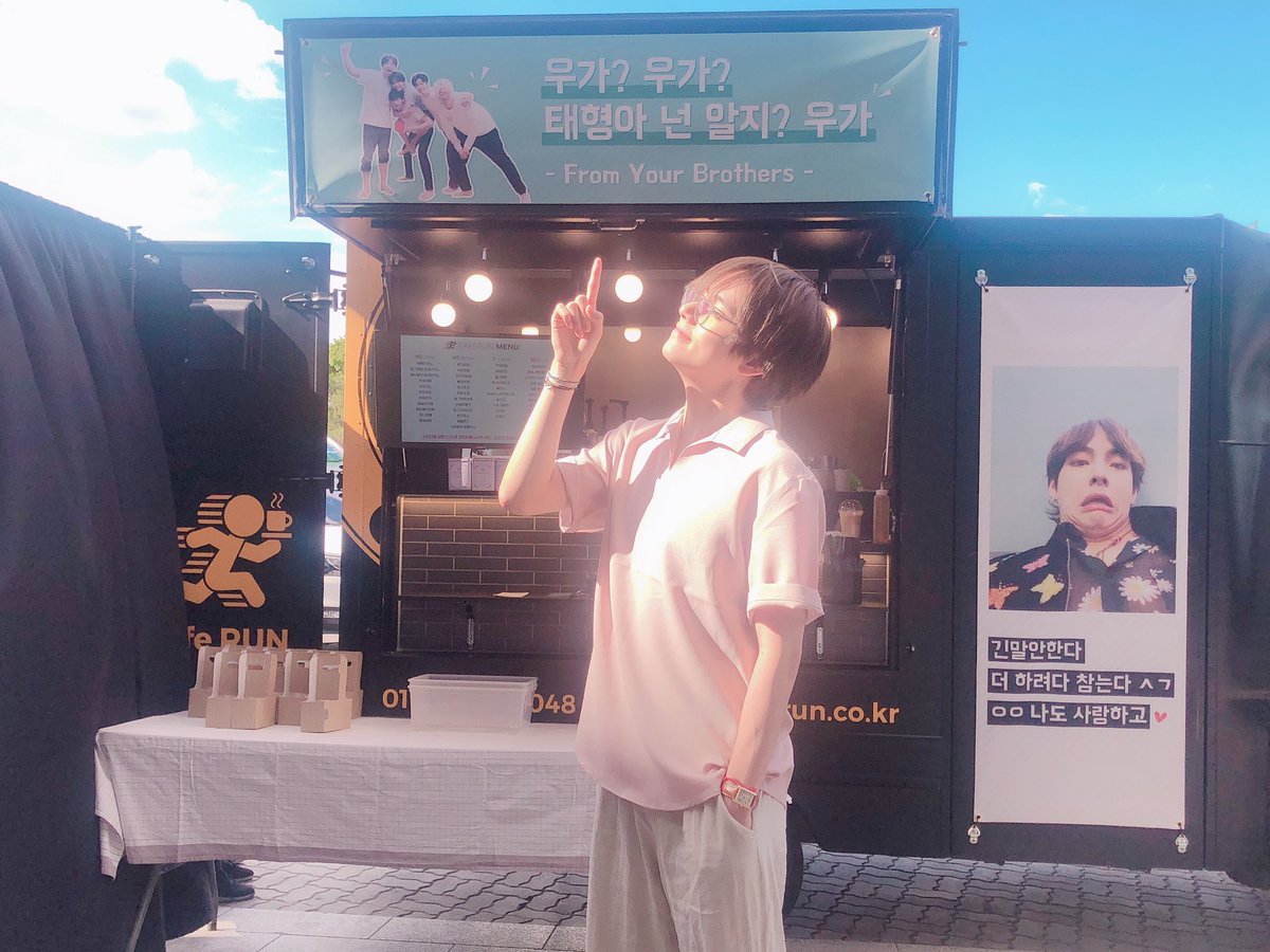 Banner 2: "Não vai dizer algo longo Nós vamos fazer isso, mas vamos segurar e fazer bem Sim, sim, amo você também" Copo: Ooga? Ooga? [Alguém perguntou por que Taehyung está com ciúmes de Jungkook, porque ele recebeu dois carros de apoios do Yeo Jingoo alguns dias atrás.]