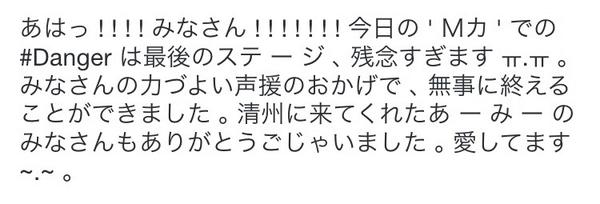 あはっ !!!! 皆さん !!!!!!! 今日エムカの最後の放送残念残念ですね ㅠ.ㅠ 皆さんの力強い歓声のおかげで舞台もよく終わりました 清州にいらっしゃったアーミーの皆さんも感謝します 愛してます~.~