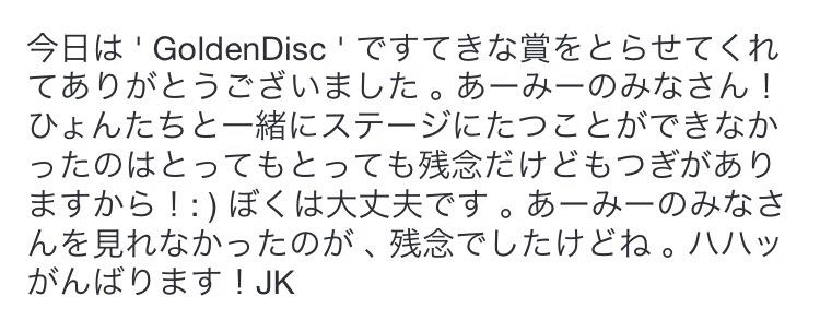 [TRANS] @BTS_twt ขอบคุณสำหรับรางวัลดีๆที่ได้มาจากงานGDAวันนี้นะครับ อาร์มี่! กับพวกฮยอง ถึงผมจะเสียดายมากที่ไม่ได้อยู่ร่วมกันบนเวทีได้ (1/2)