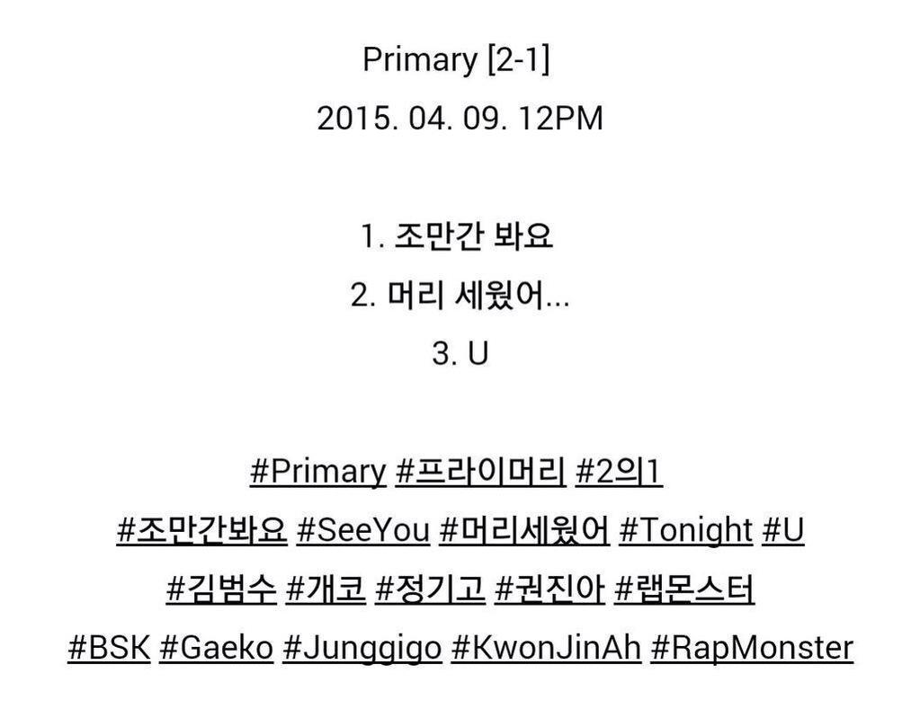 @BTS_twt (翻譯)Primary哥的新單曲2-1中和權珍雅一起參與。4月9日問市!以個人作業幸福。請多多聽。pic.twitter.com/EZhXo2vLjw