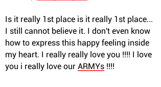 @BTS_twt: ที่นึงจริงหรอ ที่1จริงดิ จนป่านนี้ก็ยังไม่อยากจะเชื่อเลยครับ ผมไม่รู้จะแสดงความรู้สึกมีความสุขแบบนี้ออกมายังไงเลยอ่ะครับ -