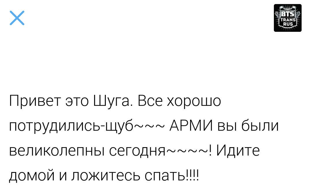 【@BTS_twt】こんにちはシュガです 皆さんお疲れ様でシュプ~~~ 今日アーミー最高でした~~~~~~!!!! 家に帰ってゆっくり休んで!!!!
