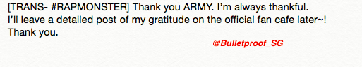 [TRANS 1/2] @BTS_twt: ขอบคุณนะครับอาร์มี่ เป็นหัวใจที่รู้สึกขอบคุณอยู่เสมอเลยครับ