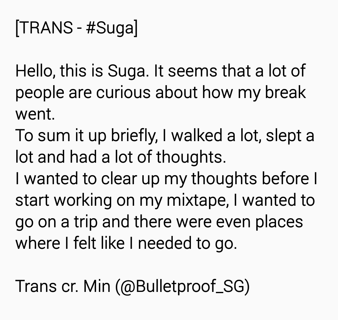 @BTS_twt (翻譯) 大家好 我是SUGA。大家對我的休假感到很好奇。要說的簡單點的話,走了很多睡了很多想了很多。製作mixtape前想要整理思緒,想要去旅行。也有著一定要去的地方