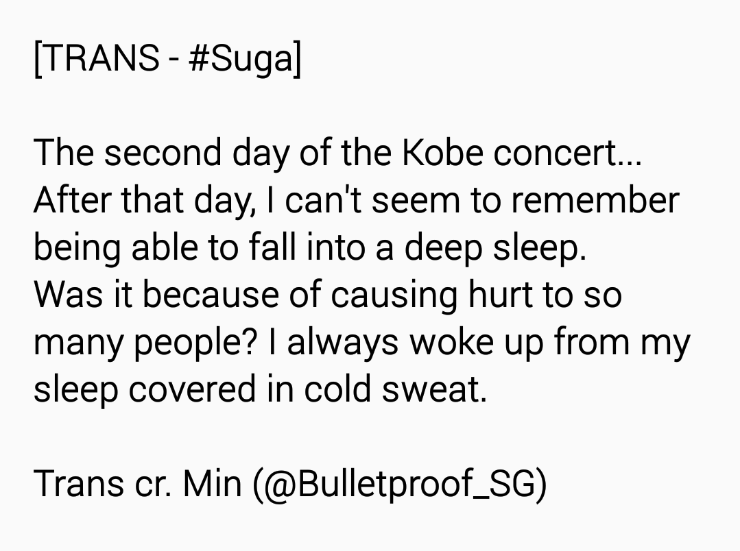 @BTS_twt (翻譯) 神戶演唱會第二天..那天之後我好像沒有睡得很沉的記憶。給予許多人傷害的關係,總是在睡著時,在夢中冒著冷汗中驚醒。
