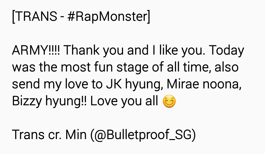 @BTS_twt アームィー!!!!ありがとうございます 好きです 今日歴代級に楽しいステージでした also send my love to JKヒョン ミレヌナ Bizzyヒョン!! Love you all